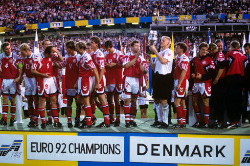 Au Ullevi Stadion de Goteborg, Allemands et Danois s’affrontent pour le titre. Et à vrai dire, on ne voit pas comment les allemands champions du monde, emmenés par Lothar Matthaus peuvent échouer. Et ce malgré les belles découvertes danoises de l’Euro comme Schmeichel, Henrik Larsen ou Brian Laudrup. De plus les danois ont eu un jour de repos en moins avec une prolongation et on le sait ça peut compter, tout comme l’expérience des finales. Mais voilà le football reste un sport unique, parce qu’il est imprévisible, et effectivement dans cette finale, match il n’y aura pas. Ce qui est étonnant c’est que la cause en revient au Danemark qui se balade. Les allemands sont impuissants et côté Danois tout rentre, en témoigne la frappe en lucarne de près de 20 M de Jensen. Vilfort en fin de match marquera poteau-rentrant et Schmeichel, sera comme durant le tournoi solide et impeccable. Le Danemark est couronné et c’est totalement mérité pour cette génération exceptionnelle. Cette équipe ne devait pas faire l’Euro et elle aura finalement terrassée, France et Angleterre auteurs de parcours parfait en éliminatoires, les Pays-Bas tenants du titre et l’Allemagne championne du monde. Le tout sans le moindre complexe. Il n’y a juste qu’à applaudir et s’incliner devant une telle performance.